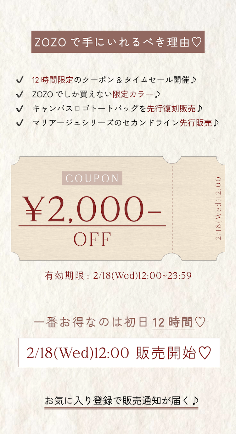 2026 2,18 ZOZOTOWN OPEN記念♡キャンバスロゴトートバッグとマリアージュセランの詳細はこちら