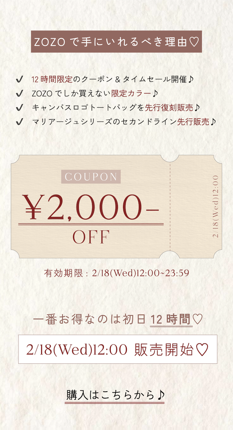 2026 2,18 ZOZOTOWN OPEN記念♡キャンバスロゴトートバッグとマリアージュセランの詳細はこちら
