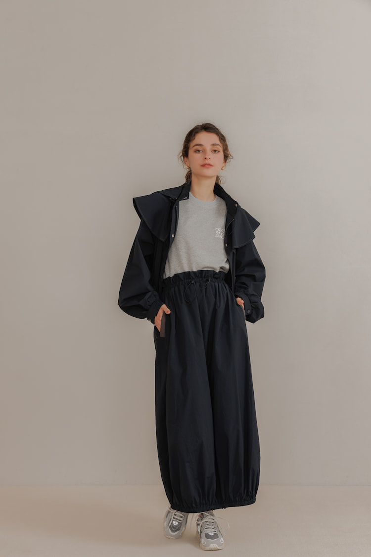 ウエスト部分と裾の部分には絞りが付いているため、ご自身の体型にフィットするシルエットに調整しご着用ください。